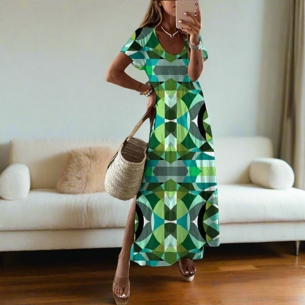 This loose-fitting maxi dress exudes sunny energy. Made from a cotton-like polyester fabric that feels as soft as cotton, it also has the durability and easy-care qualities of polyester. With a V-neck and short sleeves, this dress allows for breathability and freedom of movement. The straight silhouette offers a relaxed, feminine fit that flatters all body types.