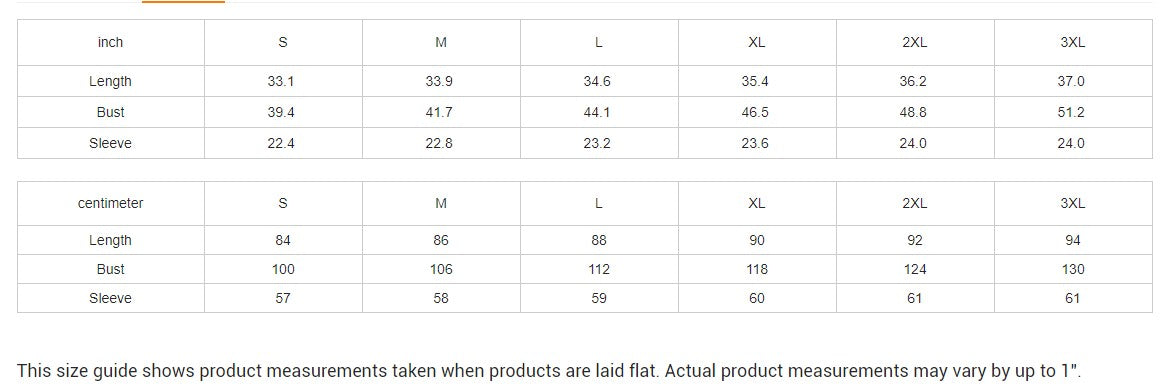 | Sleeve | 22.4 | 22.8 | 23.2 | 23.6 | 24.0 | 24.0 |