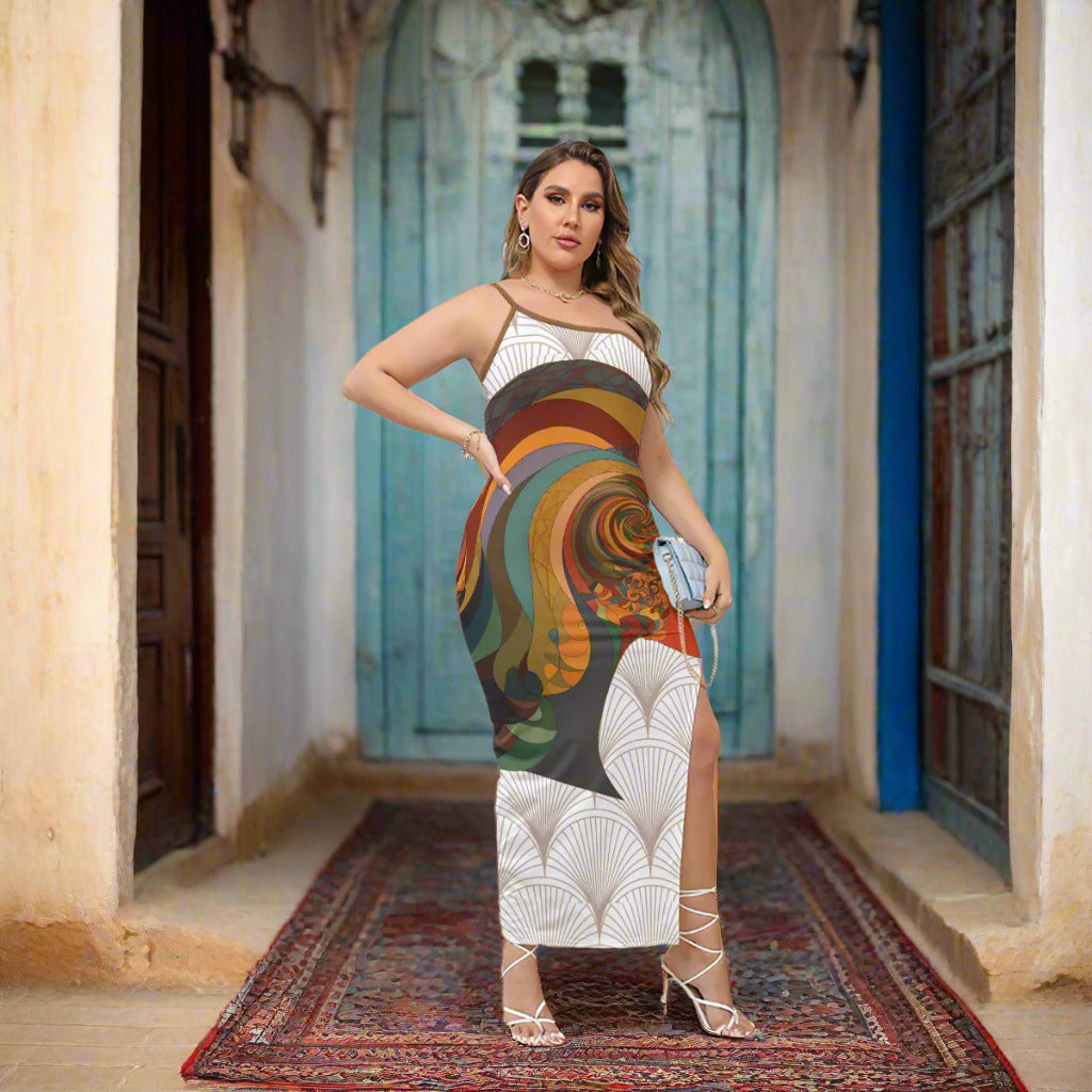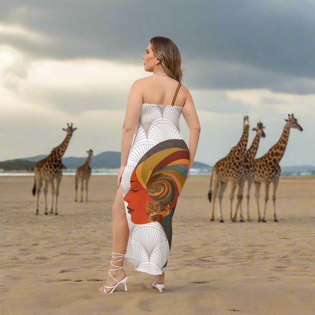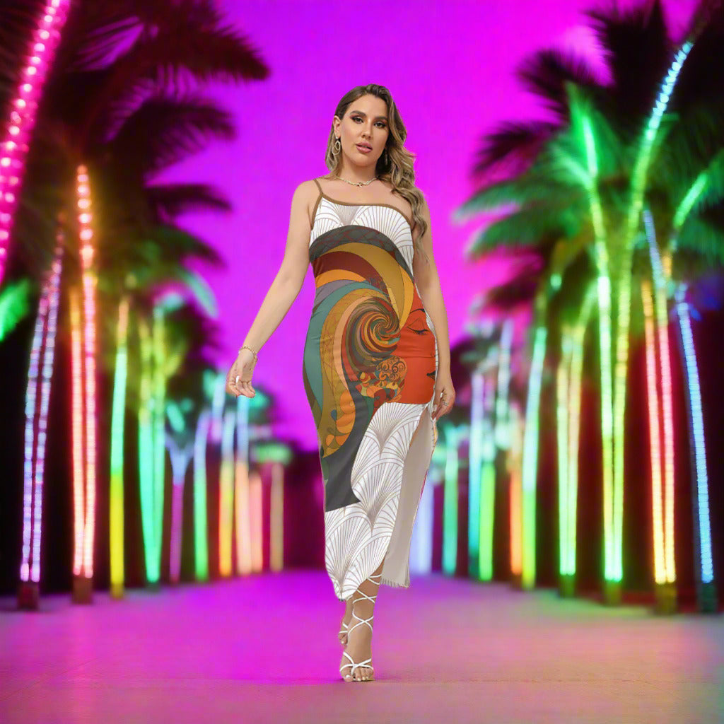 - Side Split, sleeveless, single strap, oblique-shoulder exposure