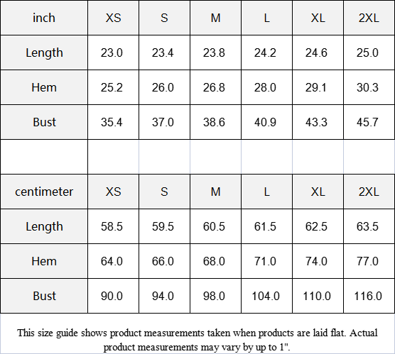 This size guide shows product measurements taken when products are laid flat. Actual product measurements may vary by up to 1".
