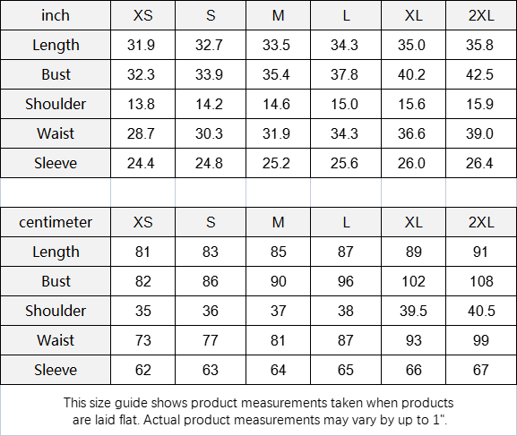 This size guide shows product measurements taken when products are laid flat. Actual product measurements may vary by up to 1".
