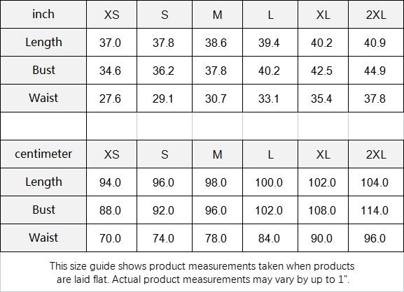 | Waist | 27.6 | 29.1 | 30.7 | 33.1 | 35.4 | 37.8 |