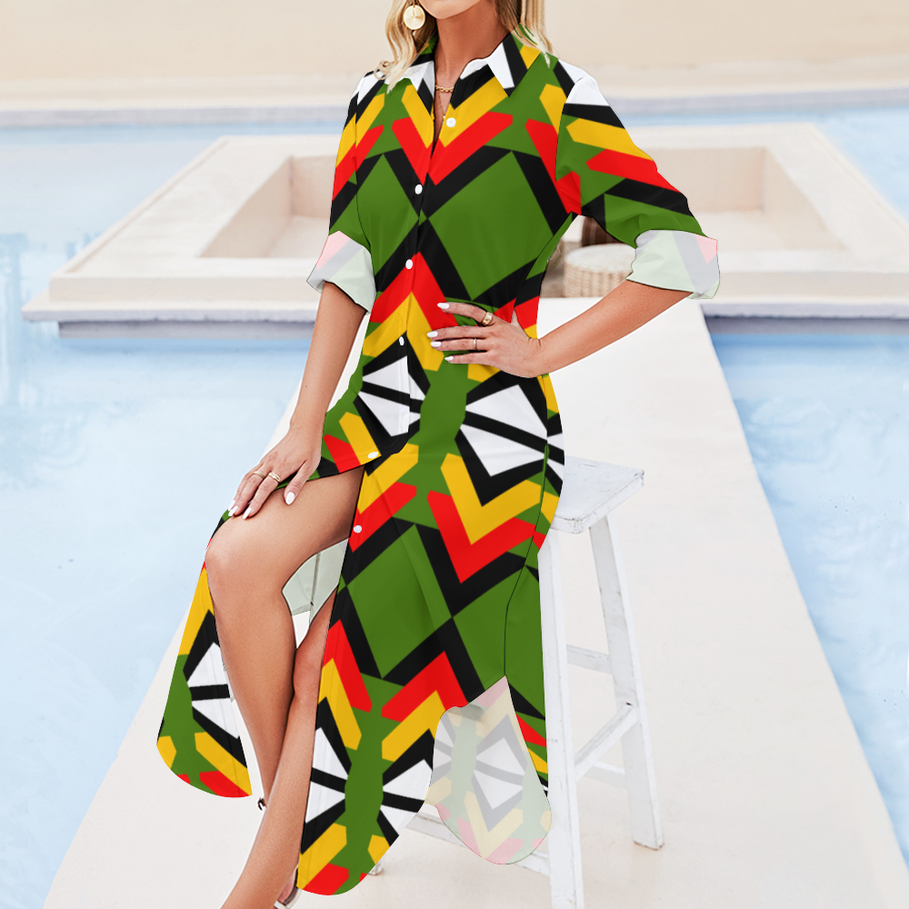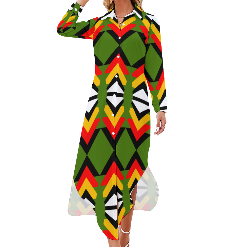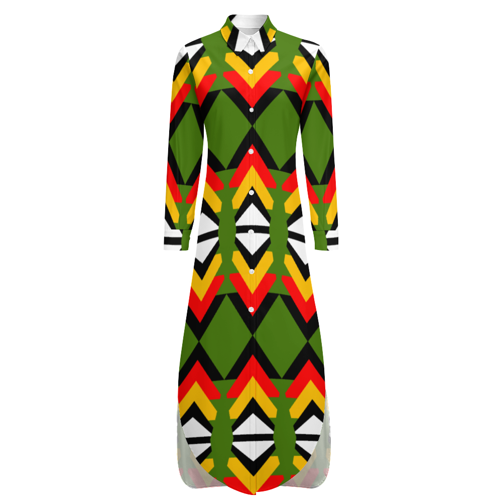 Custom Women's Long Sleeves Shirt Dress Button Up Slit Skirt