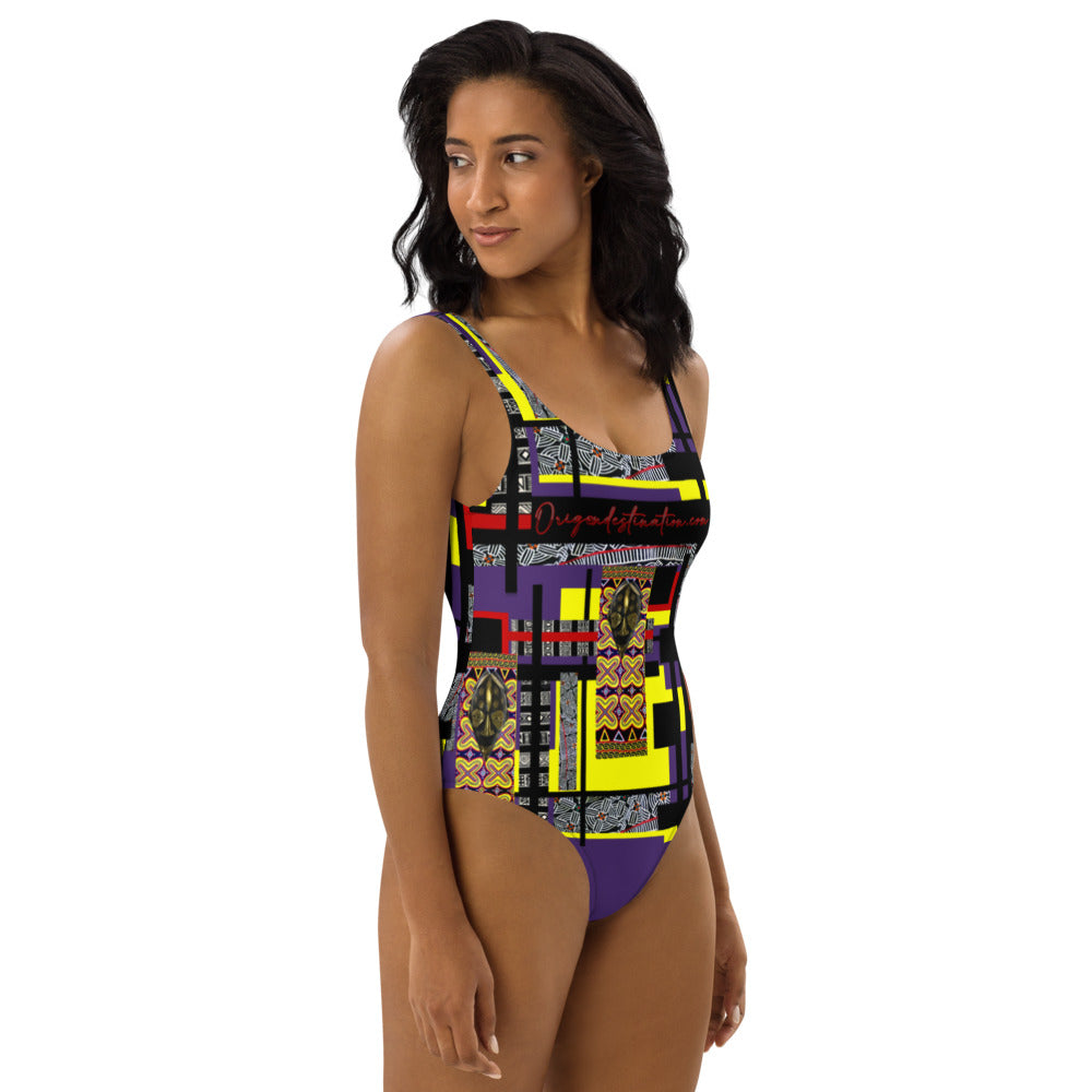 Origen Destination |On-Arrival Point of Origɛn African Symbol-inspired Purple/Gold One-Piece Swimsuit